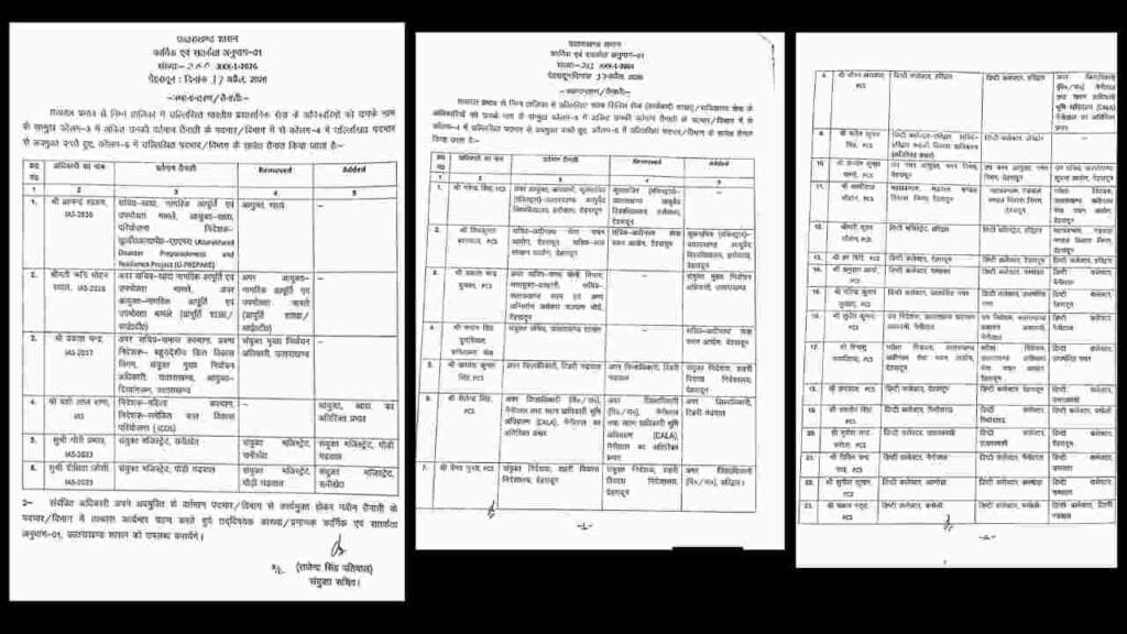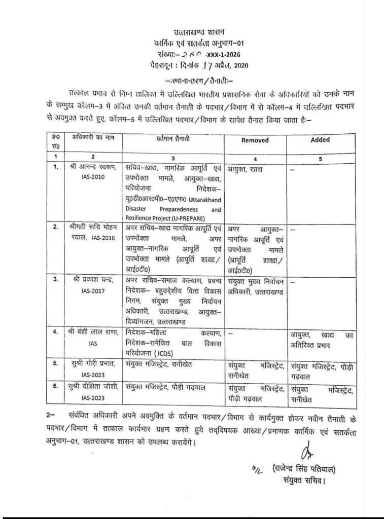 उत्तराखंड में बड़ा प्रशासनिक फेरबदल: कई IAS और PCS अधिकारियों के तबादले, देखें पूरी लिस्टदेहरादून: उत्तराखंड शासन ने प्रशासनिक व्यवस्था को चुस्त-दुरुस्त करने के लिए एक बड़ा फेरबदल किया है। कार्मिक एवं सतर्कता विभाग द्वारा जारी आदेश के अनुसार, राज्य में तैनात कई वरिष्ठ भारतीय प्रशासनिक सेवा (IAS) और प्रांतीय सिविल सेवा (PCS) अधिकारियों के कार्यभार में तत्काल प्रभाव से बदलाव किया गया है।