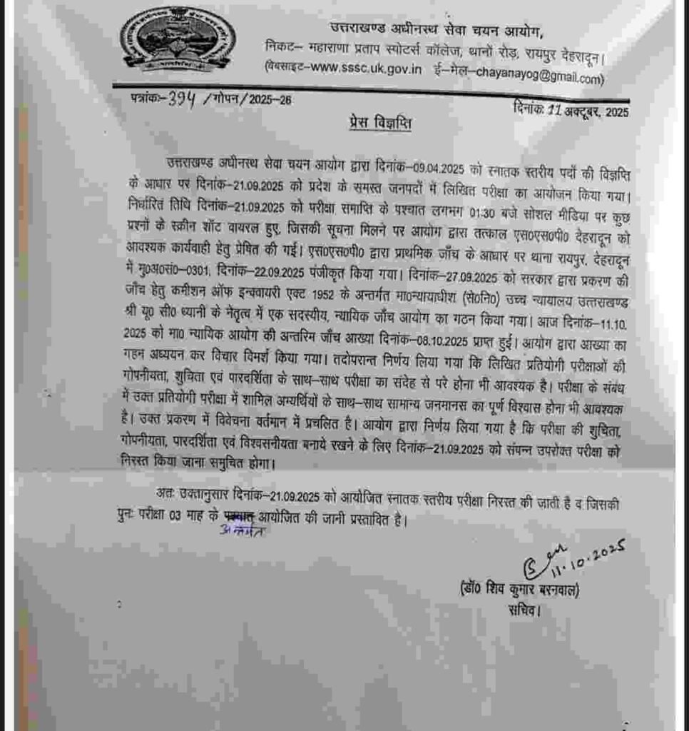 उत्तराखंड अधीनस्थ सेवा चयन आयोग (UKSSSC) द्वारा 21 सितंबर को आयोजित स्नातक स्तर की परीक्षा को आयोग ने रद्द कर दिया है। यह फैसला परीक्षा के दौरान नकल और बड़े पैमाने पर गड़बड़ी के मामले सामने आने के बाद लिया गया है। राज्यभर के अभ्यर्थी लगातार परीक्षा की पारदर्शिता पर सवाल उठाते हुए इसे रद्द करने की मांग कर रहे थे।
