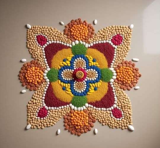 - कैसे बनाएं: विभिन्न प्रकार के रंगीन अनाज और दालों (जैसे, चावल, हल्दी वाला चावल, मूंग दाल, मसूर दाल, मेथी दाना) का उपयोग करें। इन अनाजों को सीधा या किसी प्लेट की मदद से गोल आकार में भरकर रंगोली का रूप दें। यह न केवल प्राकृतिक है, बल्कि एक अनोखा टेक्सचर भी प्रदान करती है।