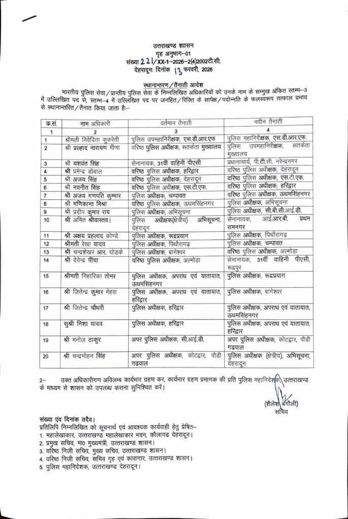 | 17 | श्री जितेन्द्र चौधरी | पुलिस अधीक्षक, हरिद्वार | पुलिस अधीक्षक, अपराध एवं यातायात, उधमसिंह नगर |