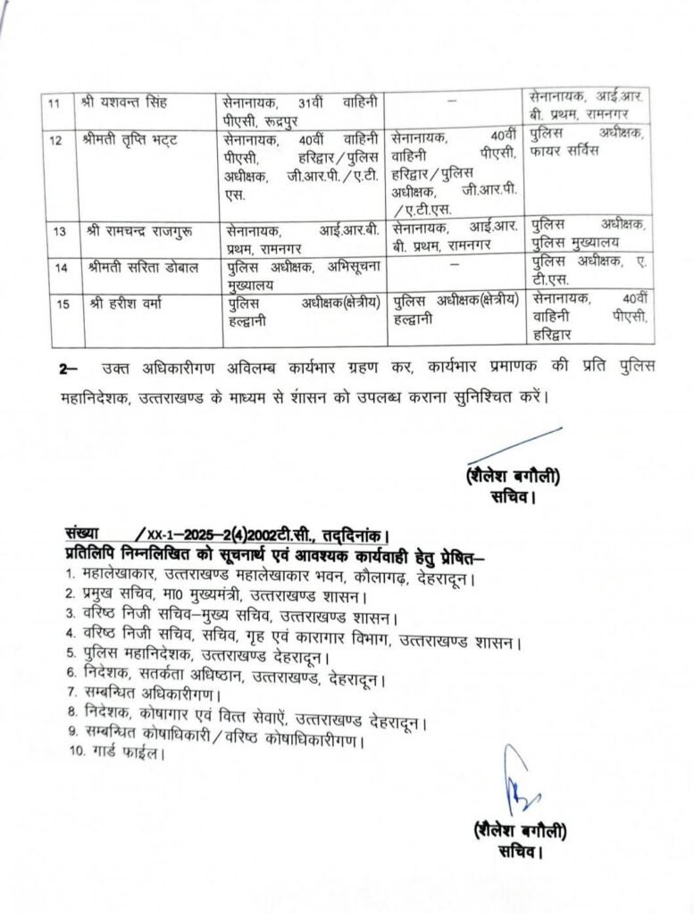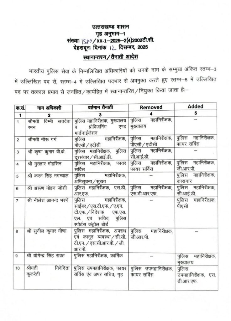 उत्तराखंड में बड़े पैमाने पर आईपीएस अफसरों के ट्रांसफर किए गए हैं। शासन ने अपर सचिव गृह के पद पर भी नए आईपीएस अफसर की तैनाती कर दी है। इसके साथ ही सीआईडी के आईजी के पद पर भी नए अफसर की तैनाती की है।
