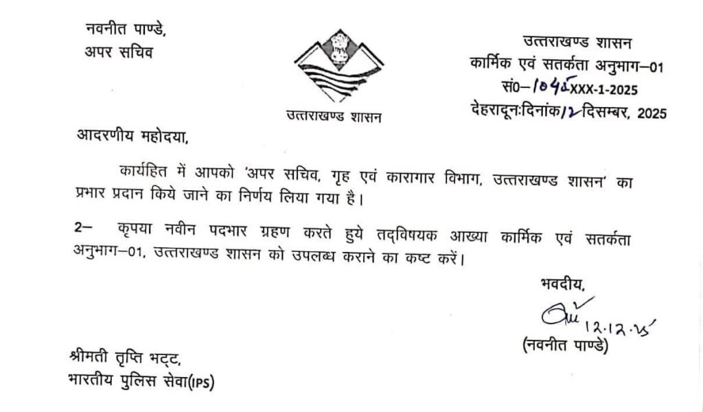 उत्तराखंड में शासन ने शुक्रवार को 15 आईपीएस (Uttarakhand IPS Officers) की जिम्मेदारियों में फेरबदल कर दिया है। सचिव गृह शैलेश बगोली की ओर से जारी आदेश के मुताबिक अब आईपीएस तृप्ति भट्ट को अपर सचिव गृह और कारागार की जिम्मेदारी दी गई है। वहीं आईजी कृष्ण कुमार वीके से सीआईडी की जिम्मेदारी लेकर तेज तर्रार अफसर माने जाने वाले आईजी अरुण मोहन जोशी को ये जिम्मेदारी सौंपी गई है।